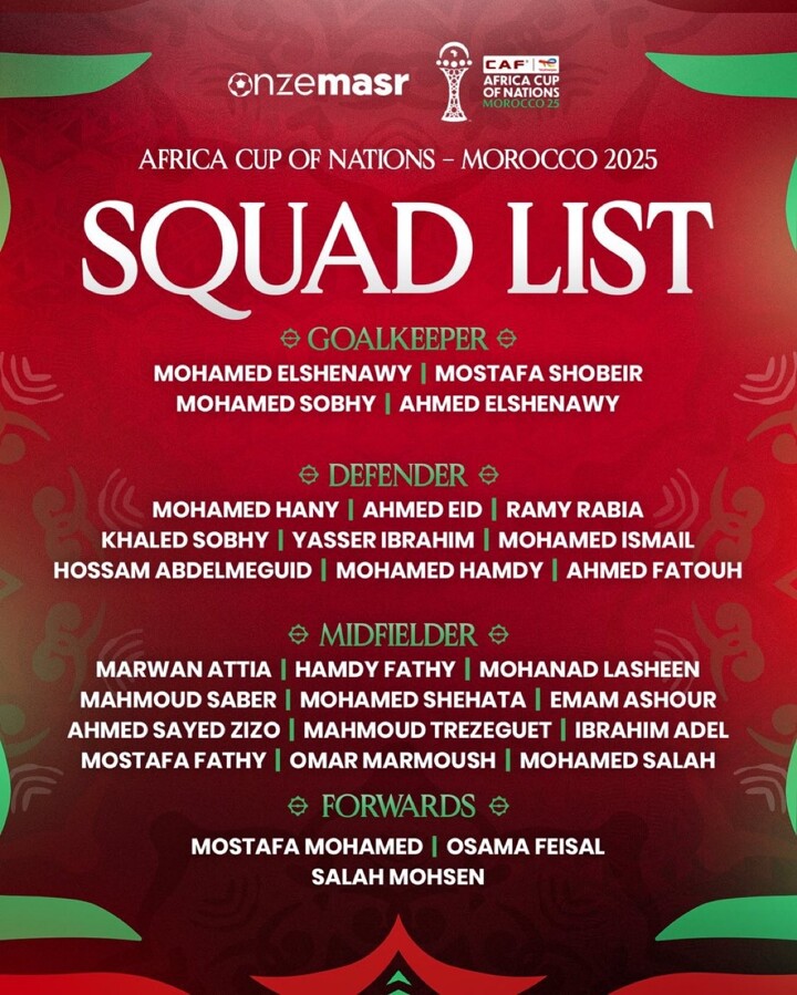 Tim nasional Mesir telah mengumumkan skuad resmi untuk Piala Afrika. Pengumuman ini dilakukan pada 11 Desember untuk menghadapi turnamen bergengsi tersebut.