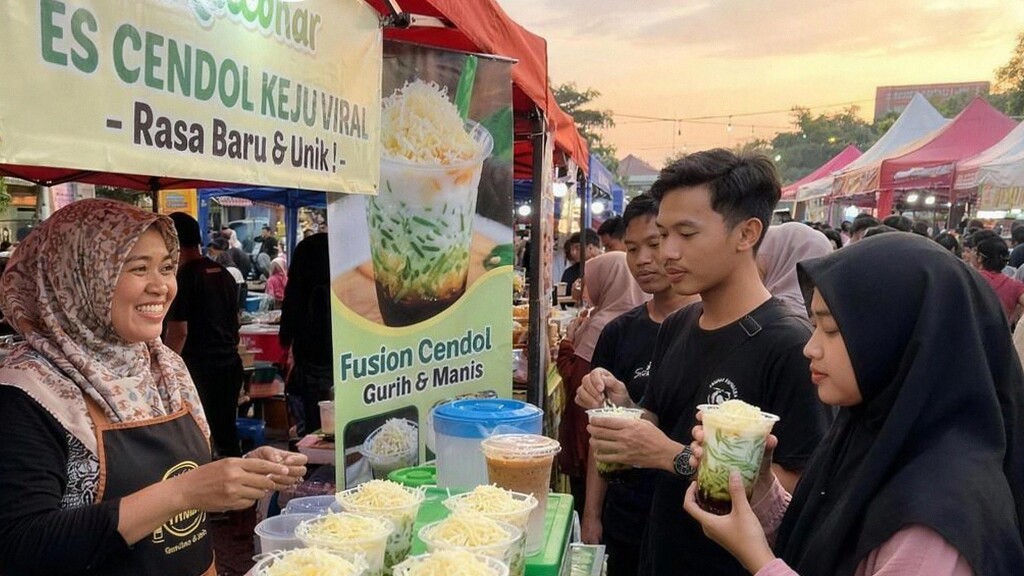 Inovasi ini menambahkan keju parut atau pasta keju ke dalam adonan cendol. Rasa gurih keju berpadu manis dengan gula aren sehingga menghadirkan sensasi yang berbeda. Ide ini menarik segmen anak muda penggemar kuliner fusi dan berpotensi viral karena rasa yang unik. Penting agar keju tercampur rata agar setiap butir cendol memiliki cita rasa konsisten.