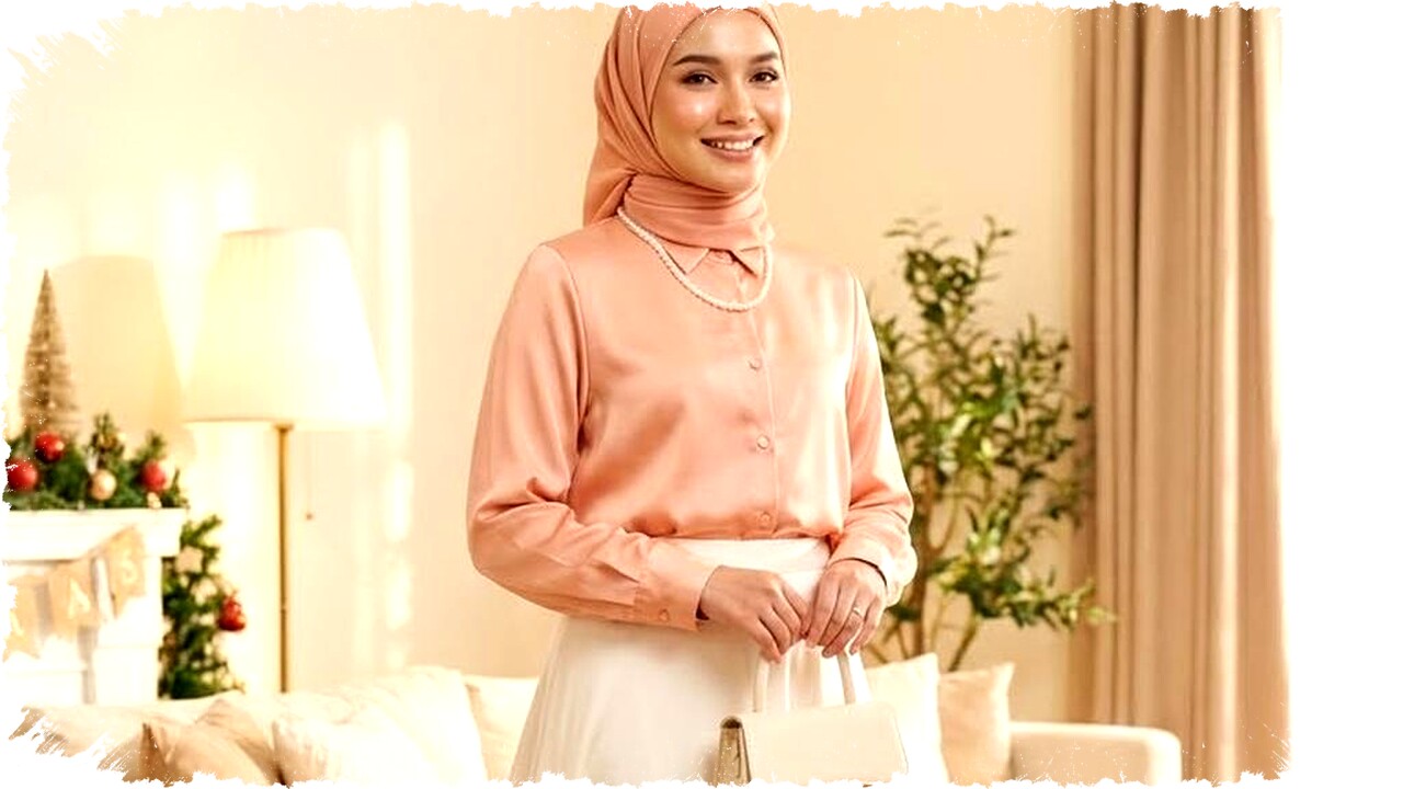 Peach memberikan kesan hangat dan glowing, sementara ivory menambah kelembutan dan anggun. Blouse warna peach dengan bahan satin akan tampak segar saat dipadukan dengan rok ivory flowy. Warna terang ini membuat wajah tampak bercahaya dan memberikan kesan feminin. Sepatu nude dan tas cream menyempurnakan tampilan. Aksesori mutiara mempercantik, cocok untuk Anda yang mencari kesan manis namun elegan di Hari Raya.