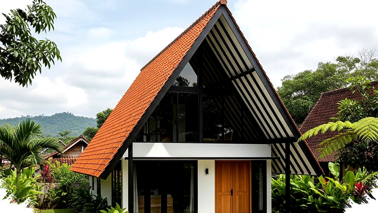 Material atap seperti genteng tanah liat atau metal berpasir sering dipilih karena membantu mengurangi panas berlebih. Sementara itu, dinding putih bersih membuat rumah tampak ringan dan modern di tengah lingkungan hijau.