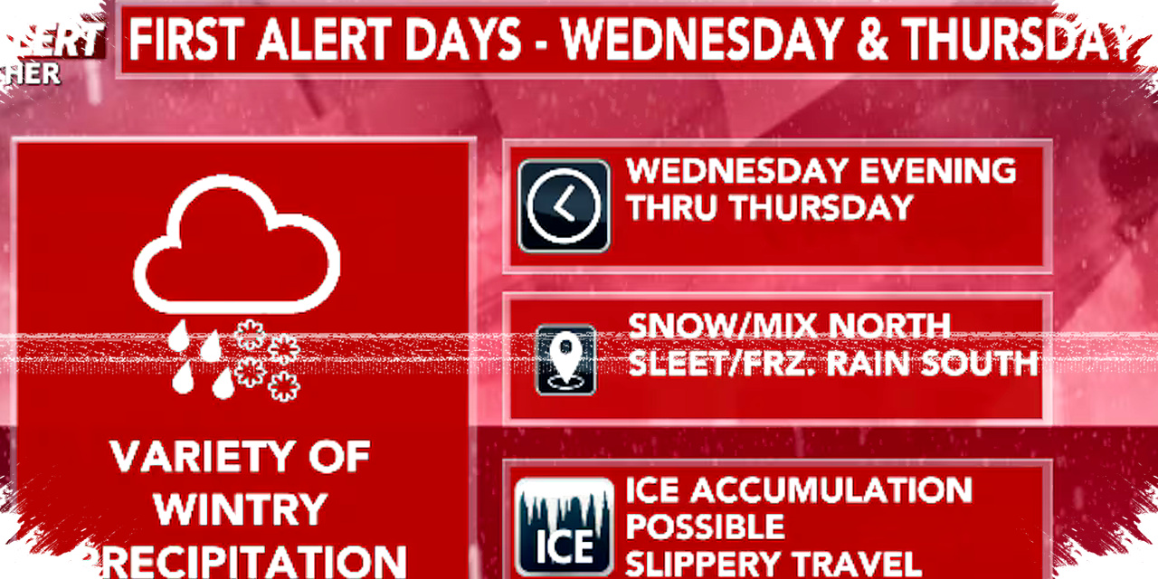 The system is expected to move in late Wednesday and continue through Thursday with changing precipitation types across the region. Snow should begin first in the north, then spread more widely by Thursday morning before mixing with sleet and freezing rain.