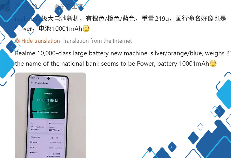 Daya tahan menjadi poin utama Realme Power. Dengan kapasitas baterai 10.001mAh, perangkat ini jauh melampaui rata-rata smartphone saat ini yang umumnya menawarkan baterai 5.000mAh hingga 6.000mAh. Menurut bocoran dari Digital Chat Station, bobot ponsel ini hanya sekitar 219 gram.
