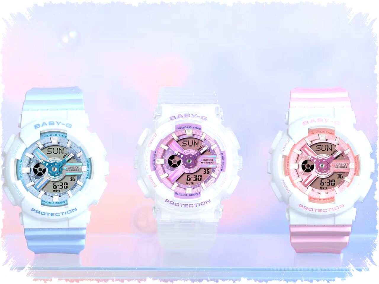 Ketiga model ini menggunakan bezel, dial, dan tali berbahan resin yang diberi lapisan polarisasi untuk efek glossy. Warna biru pastel menghiasi BA-110PD-2A, sedangkan BA-110PD-4A tampil dengan warna pink yang ceria. Model BA-110PS-7A menawarkan kombinasi warna pink dan ungu pada dial serta dilengkapi dengan tali transparan yang memberikan kesan modern dan segar.