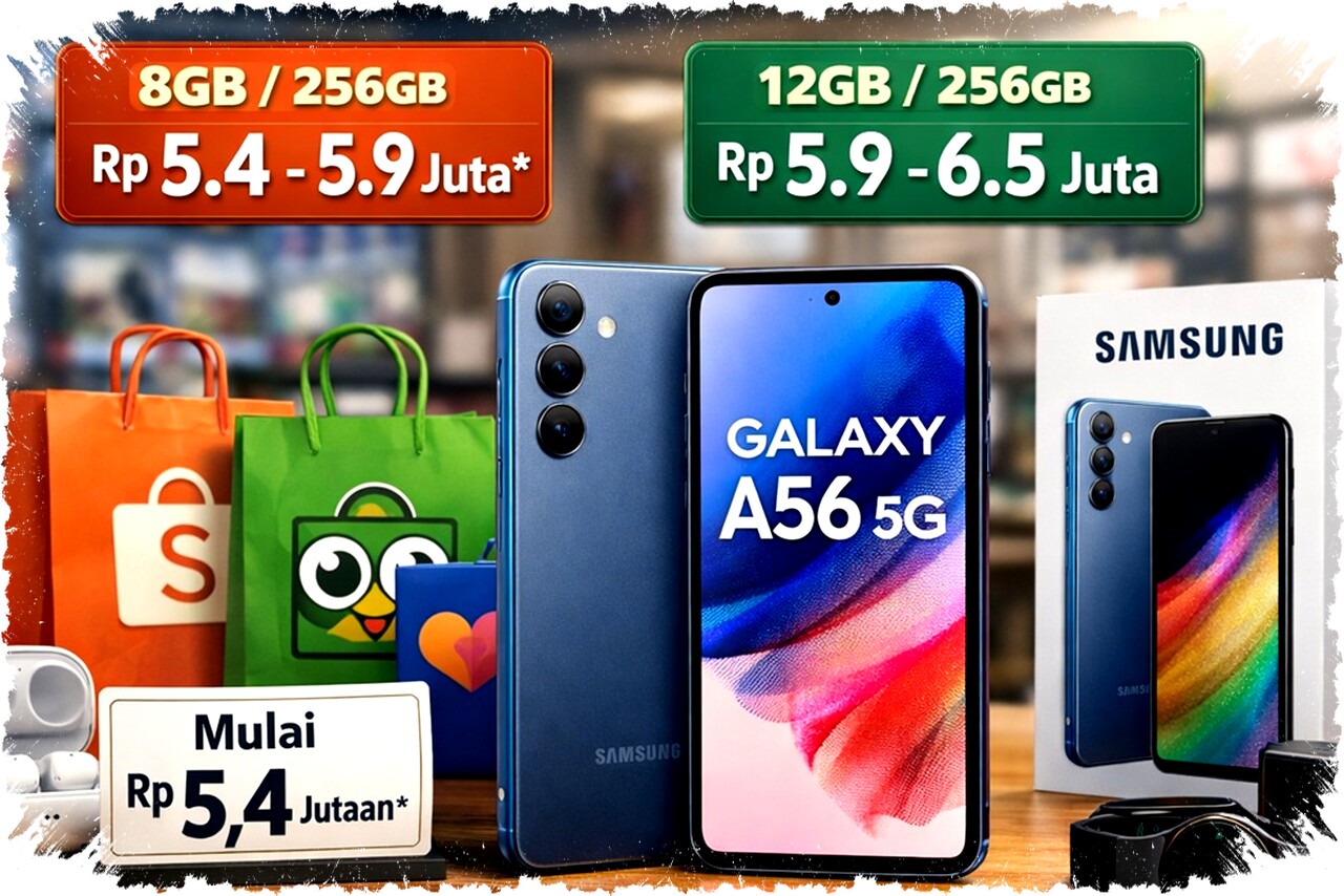 Samsung Galaxy A56 5G kini mengalami penurunan harga yang cukup signifikan di pasar Indonesia. Saat ini, harga ponsel kelas menengah ini berada di kisaran Rp5,5 juta hingga Rp6,5 juta, lebih terjangkau dibandingkan saat peluncuran yang mencapai di atas Rp7 juta.