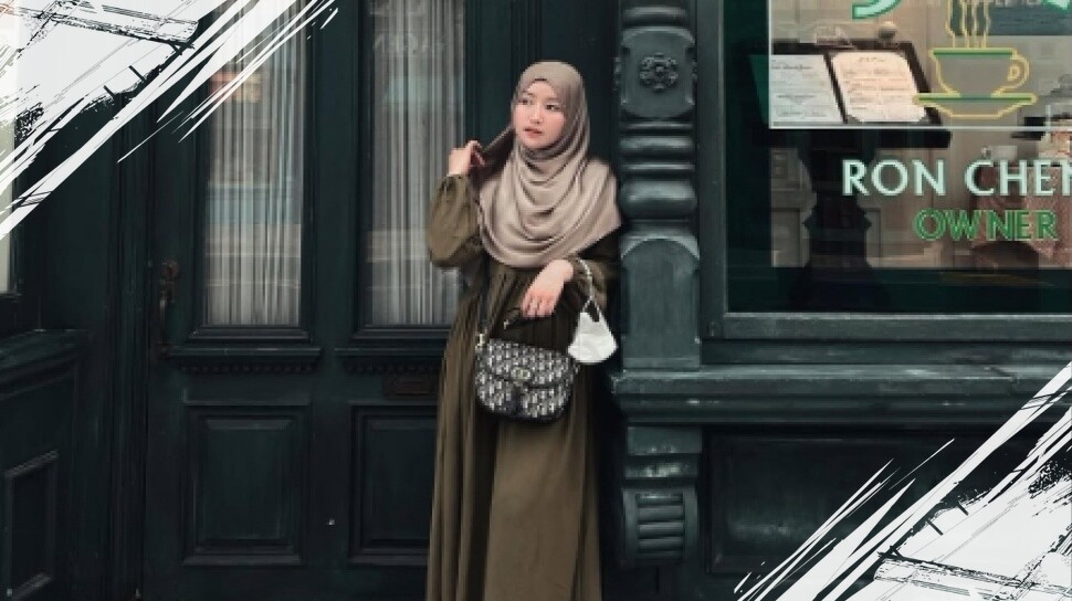 Gaya ketiga mengusung warna earth tone seperti olive green pada gamis polos dan hijab cokelat susu. Kombinasi ini memberikan suasana tenang dan alami. Monica menambahkan tas monogram hitam putih sebagai aksen mewah dan sepatu boots hitam untuk kesan elegan tanpa berlebihan. Cocok untuk kamu yang ingin tampil simpel tapi tetap berkelas.