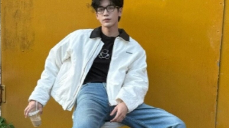Styling pertama yang bisa kamu tiru adalah penggunaan jaket off white dengan potongan bersih. Zhang Ling He memadukannya dengan kaos putih polos di dalam yang memberikan kesan rapi sekaligus cerah. Celana jeans biru muda dengan potongan wide leg memberi nuansa retro nyaman sekaligus santai. Detail rumbai di bagian bawah celana menambah sentuhan modern agar tampilannya tidak monoton.