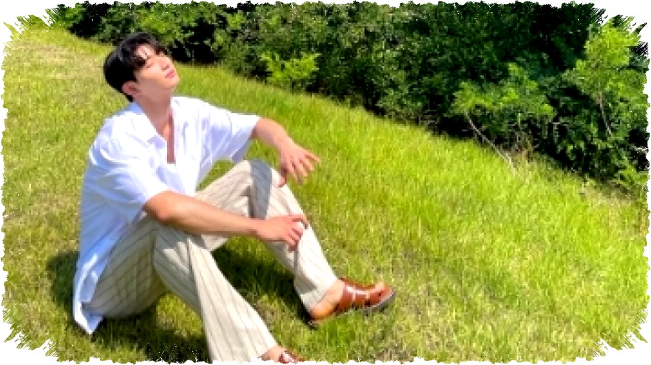 Gaya pertama Kim Jae Won menampilkan kesan clean boy yang estetik dengan menggunakan kemeja putih oversized lengan pendek. Kemeja berbahan katun ini dipakai sebagai outer dan dibiarkan terbuka untuk memberikan kesan santai namun modis. Di dalamnya, ia memakai ribbed tank top putih yang menonjolkan siluet tubuhnya yang proporsional.