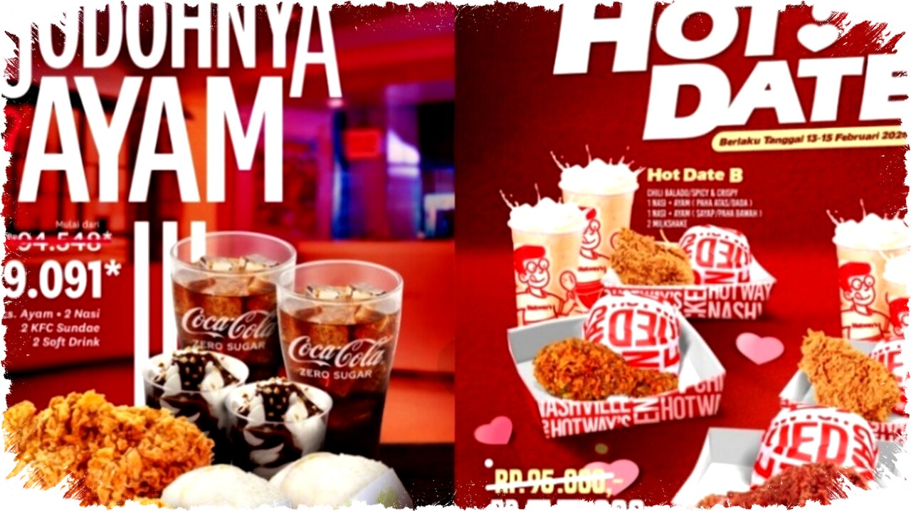 Hotway’s menawarkan paket makan berdua bernama Hot Date yang berlangsung selama 13–15 Februari 2026 di outlet yang berpartisipasi. Paket ini terdiri atas nasi, ayam, dan milkshake untuk dua orang dengan harga mulai Rp55.000.