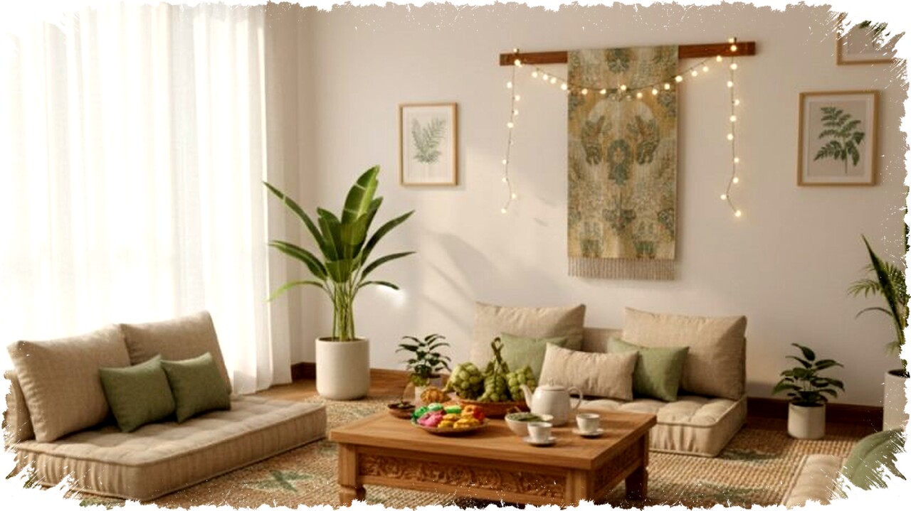 Area duduk lesehan dengan bantal duduk warna beige dan aksen hijau lembut menciptakan ruang santai ideal untuk berkumpul anggota keluarga. Meja kayu rendah di tengah memudahkan penyajian camilan khas Lebaran. Toples kaca berisi kue kering sengaja dipajang untuk menambah estetika sekaligus fungsi. Karpet bermotif lembut mempertegas zona berkumpul dan menambah kenyamanan. Pencahayaan alami dari jendela besar memberikan rasa luas dan terbuka sehingga suasana sangat hangat dan santai.