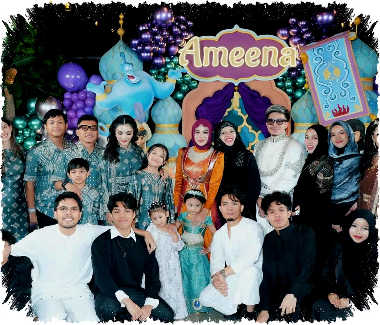 Seluruh keluarga besar hadir mengenakan gamis dengan motif dan warna khas Timur Tengah. Pilihan busana ini menambah kesan meriah sekaligus menyatu dengan konsep pesta yang diangkat.