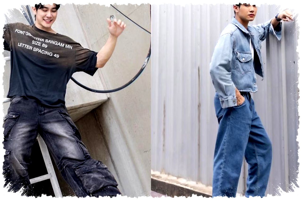 Kombinasi ini pas untuk mereka yang ingin gaya praktis tanpa banyak aksesori. Tekstur jeans yang belum selesai dan detail garis pada atasan memberi dimensi visual yang kuat, sementara sneakers memberi kesan sporty.