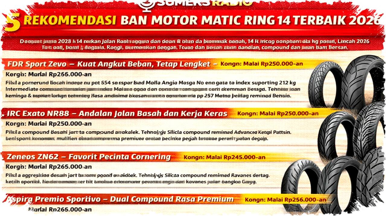 Ban motor matic ring 14 yang berkualitas tidak harus mahal. Pilihan yang tepat perlu disesuaikan dengan gaya berkendara, beban kendaraan, dan kondisi jalan yang sering dilalui. FDR Sport Zevo dan IRC Exato NR88 sangat cocok untuk penggunaan harian dengan kebutuhan beban dan daya tahan tinggi. Zeneos ZN62 menawarkan kelincahan baik untuk pengendara dinamis. Aspira Premio Sportivo mengombinasikan ketahanan dan traksi di berbagai situasi, sementara Maxxis Victra S98 ST menjadi opsi terbaik untuk performa tinggi.
