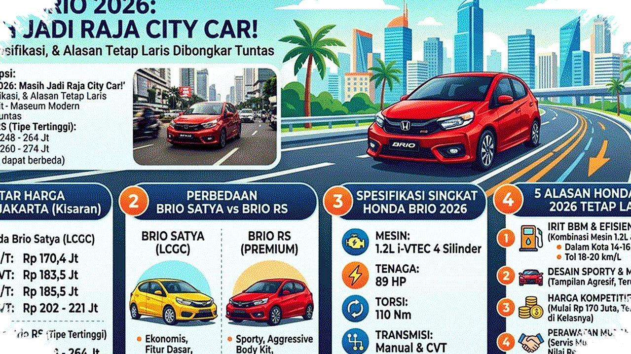 Dengan harga mulai Rp 170,4 juta dan pilihan varian yang cukup luas, Honda Brio 2026 tetap menjadi salah satu city car paling rasional di pasar. Mobil ini masih menawarkan paket lengkap bagi konsumen yang mencari kendaraan pertama, mobil keluarga kecil, atau city car harian yang praktis dan mudah dirawat.