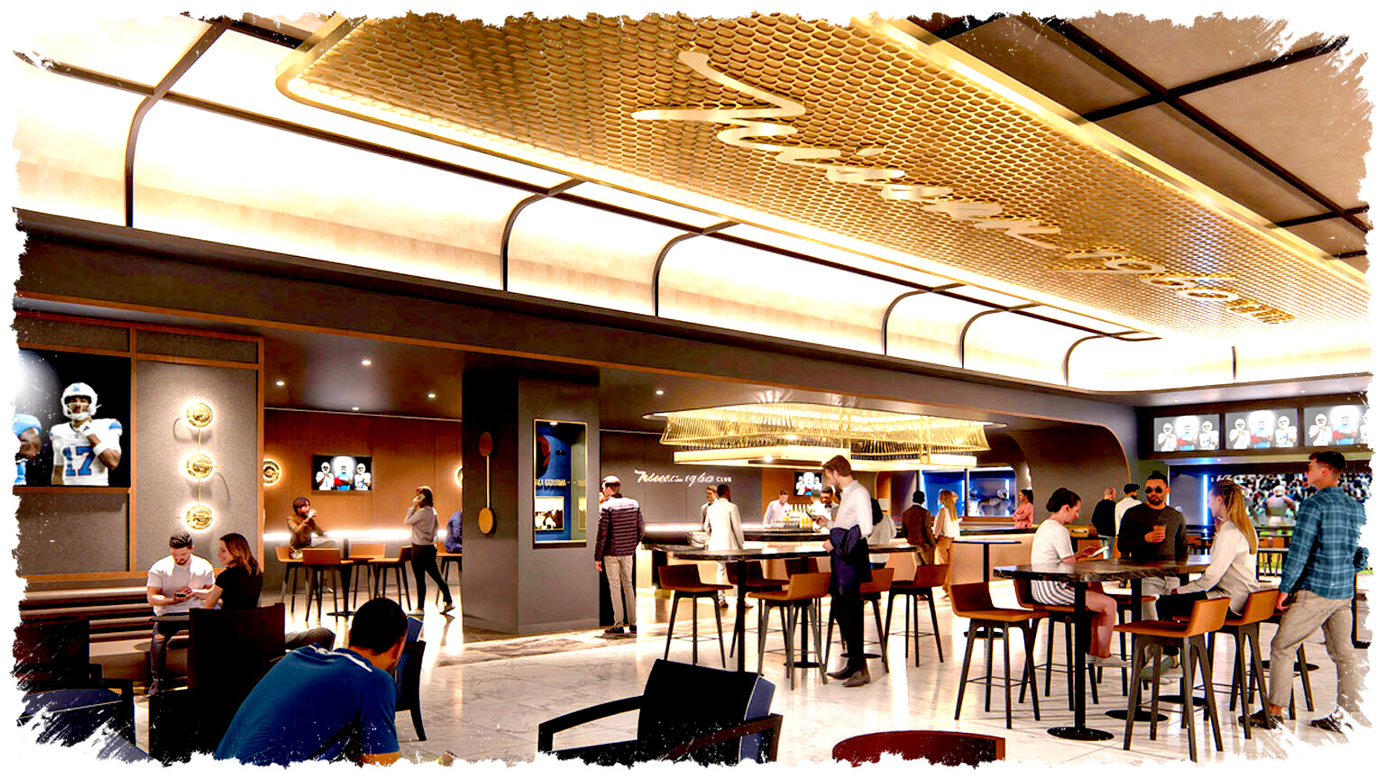 Di dalamnya, render menunjukkan bar berbentuk persegi panjang, beberapa area duduk, dan banyak layar televisi untuk mengikuti jalannya pertandingan. Ada juga area “on-field viewing” yang memungkinkan tamu menikmati laga dari titik pandang langsung ke lapangan.