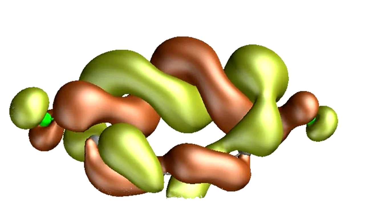 Isosurface of the Dyson orbital, taken from Piccinelli, Samuele, et al., “Exploring pathways towards quantum advantage in quantum chemistry: the case of a molecule with half-Möbius topology,” arXiv, 9 March 2026.