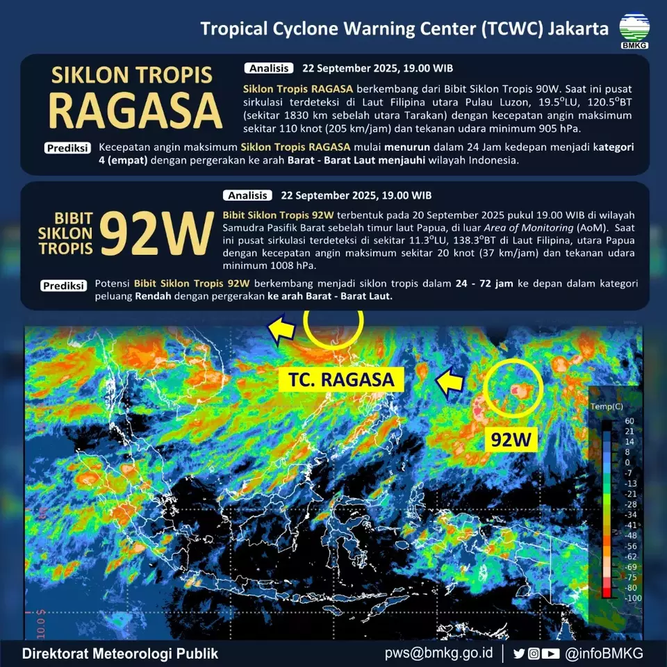 Badan Meteorologi, Klimatologi, dan Geofisika (BMKG) mengonfirmasi bahwa siklon tropis Ragasa yang terbentuk di Laut Filipina saat ini mengalami pelemahan dan bergerak menjauhi wilayah Indonesia. Dalam laporan yang dikeluarkan oleh Tropical Cyclone Warning Center (TCWC) Jakarta pada Senin (22/9/2025) malam, BMKG menyebutkan bahwa intensitas topan yang sebelumnya masuk kategori 5 kini turun menjadi kategori 4 dengan kecepatan angin maksimum mencapai 110 knot atau sekitar 205 km/jam.