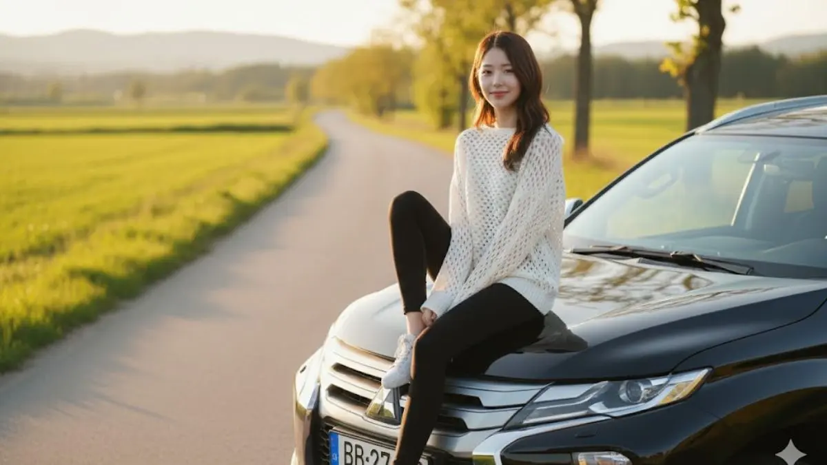 | Duduk di kap mobil | Duduk santai di kap, kaki menggantung, latar alam, golden hour, senyum ringan, refleksi bodi realistik |