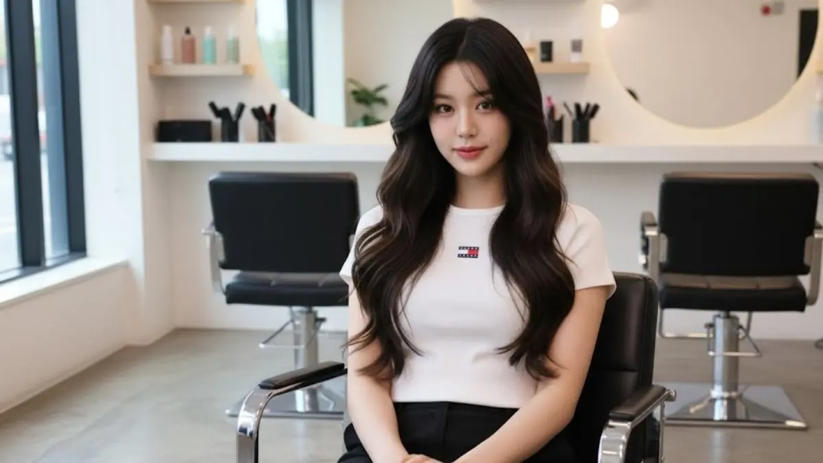 - Ubah foto agar tampak duduk di kursi salon modern, cahaya lembut masuk dari jendela, latar belakang rapi penuh perlengkapan salon, rambut mengkilap, tatapan ke kamera, ekspresi natural tersenyum, kulit halus tapi realistis.