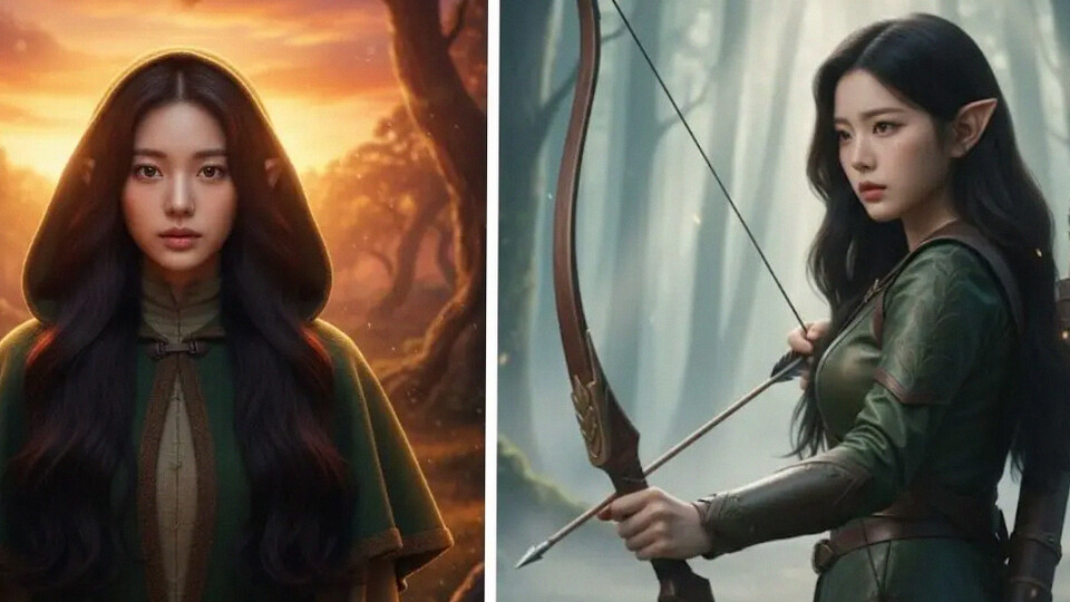 3. "Edit foto ini tanpa mengganti identitas wajah, ubah menjadi elf pemanah dengan telinga runcing alami, pose setengah badan menghadap samping, ekspresi fokus, latar hutan fantasi berkabut tipis, detail tajam, tidak terlihat ilustrasi AI."