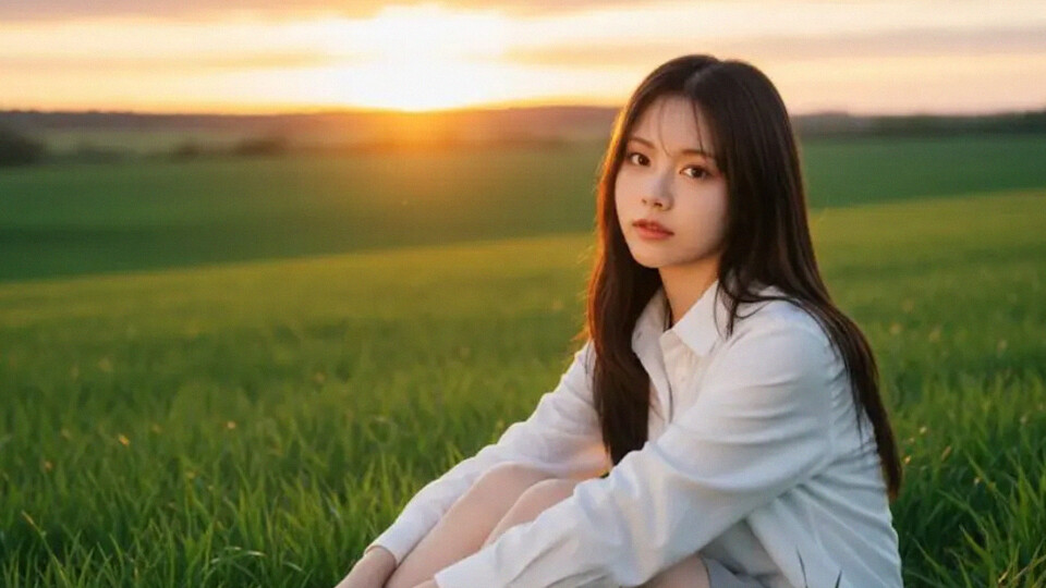 “Pertahankan wajah dan postur tubuh asli, ubah latar menjadi padang rumput hijau dengan sunset hangat di kejauhan, posisi duduk santai di rerumputan, pencahayaan golden hour alami, tekstur kulit realistis, tatapan mata lembut tidak kosong, warna seimbang seperti foto kamera profesional.” -