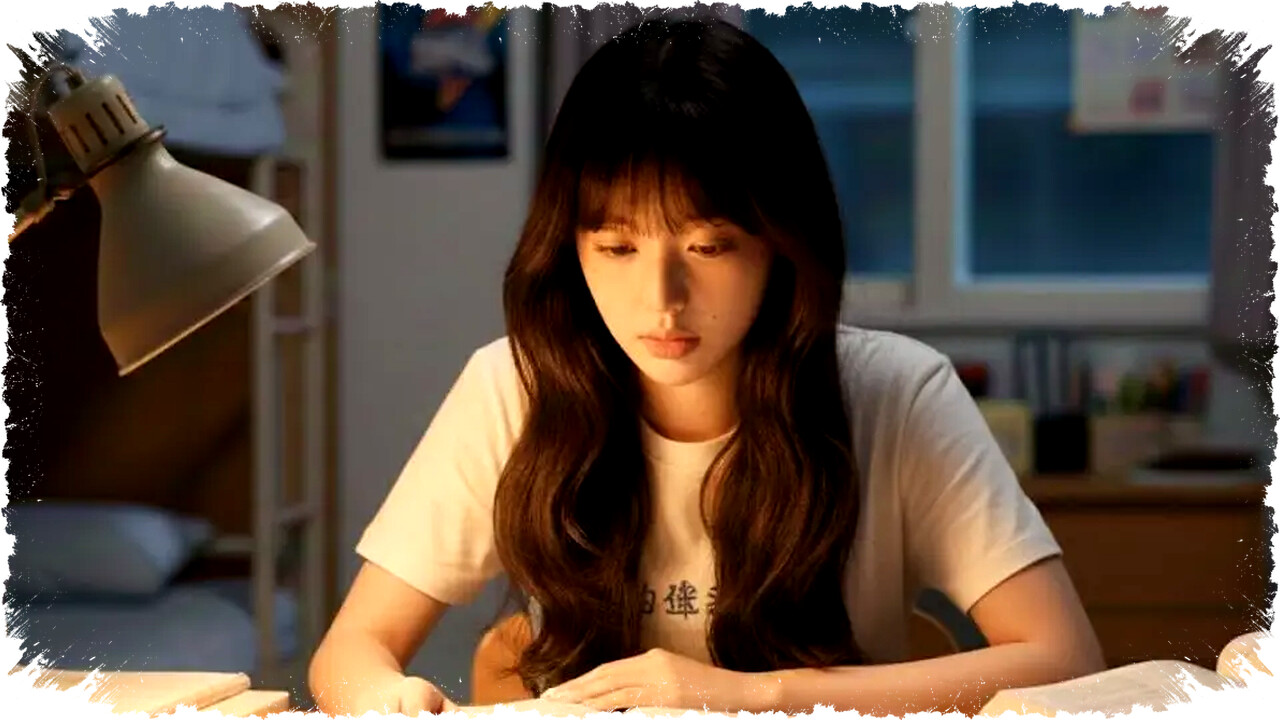"Edit foto ini agar menyerupai suasana belajar di kamar asrama sekolah, dengan pencahayaan lampu meja yang lembut dan ekspresi wajah terlihat fokus dan alami. Mata terlihat hidup, warna seimbang, detail wajah dan ruangan tetap realistis, gaya estetik sederhana dan menarik."