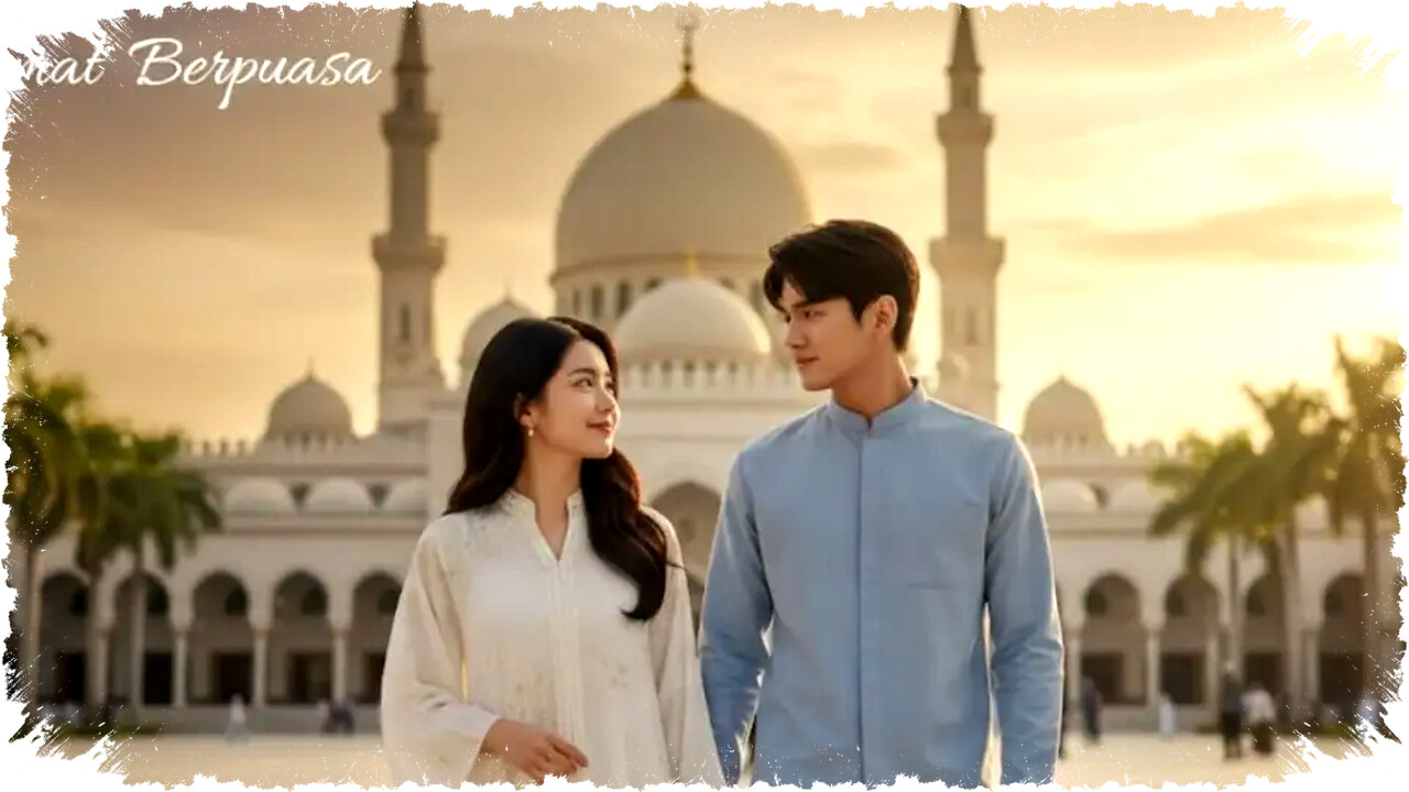 Latar belakang dihias dekorasi bernuansa Ramadhan dengan warna hangat dan efek blur halus agar perhatian tertuju pada wajah keduanya. Penempatan teks "Selamat Berpuasa" yang tipis dan elegan melengkapi kesan estetik tanpa merusak keseimbangan gambar. Hasil akhirnya terlihat sangat natural, proporsional, dan tidak menimbulkan kesan hasil generate AI.