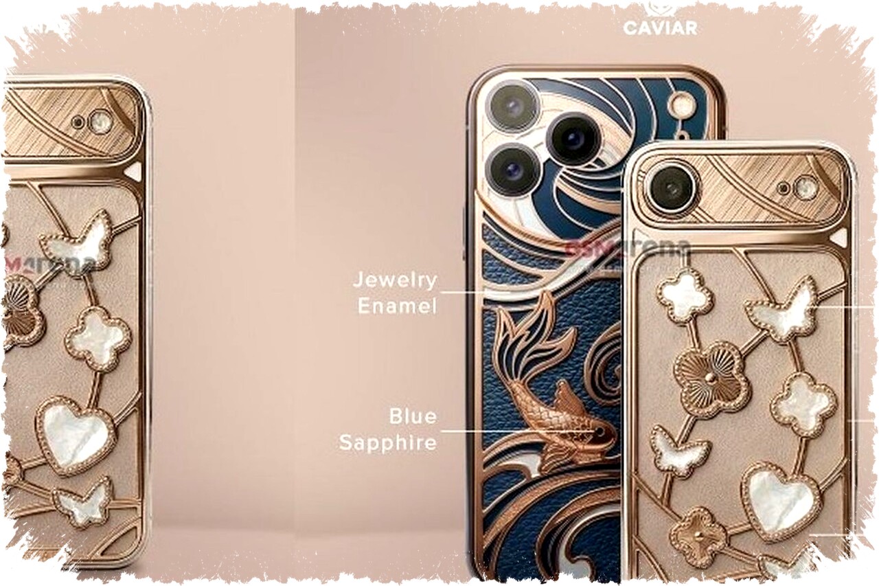 Bagian panel belakang iPhone ini memadukan warna emas kecokelatan dan putih mutiara, menciptakan kesan elegan dan sangat mewah. Hiasan mutiara asli juga memperkuat nilai estetika dalam produk ini. Para ahli Caviar menjamin setiap unit memiliki sentuhan artistik yang berbeda, hasil pengerjaan manual dengan presisi tinggi.