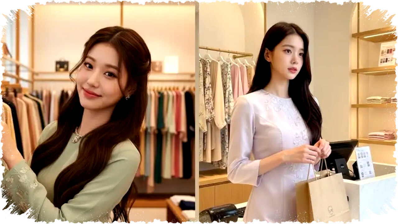 Pertahankan pose duduk dan proporsi tubuh asli. Latar diubah menjadi butik baju Lebaran dengan cermin besar dan dekorasi elegan. Busana yang ditambahkan harus terlihat pas di tubuh dengan tekstur kain lembut serta bayangan yang realistis. Atur pencahayaan lembut dari atas agar wajah tampak segar dan mata hidup. Tangan dapat difoto sedang meraba kain untuk kesan natural.