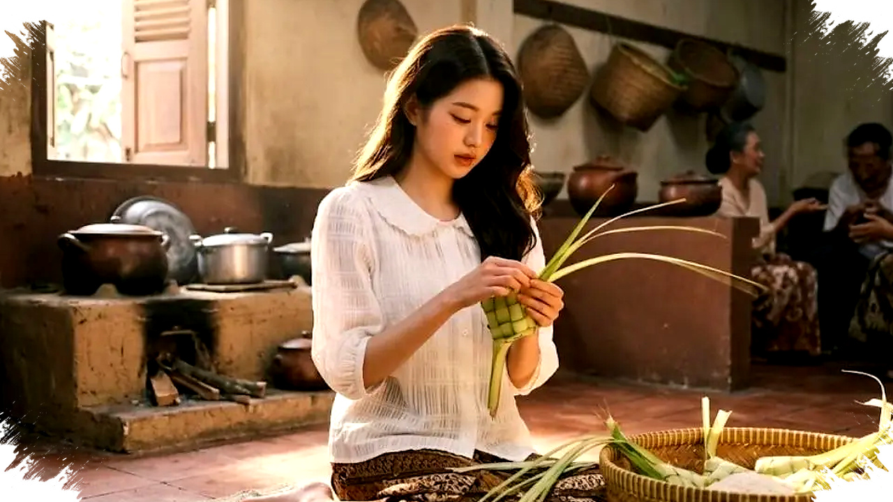 Gunakan prompt untuk mengubah foto menjadi seseorang yang sedang duduk di lantai dapur sambil menganyam daun kelapa. Tambahkan cahaya matahari lembut yang masuk dari jendela kayu untuk memberi kesan hangat alami. Sertakan elemen daun janur hijau dan keranjang bambu sebagai detail pendukung agar aktivitas tampak nyata. -
